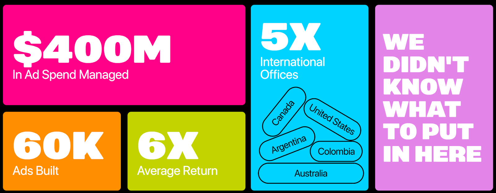 From the moment you land, you're inside the proof. They show you real ad creative with real performance metrics right on the homepage. They show you $400M in managed ad spend, 60,000 ads built, and a 6x average return.